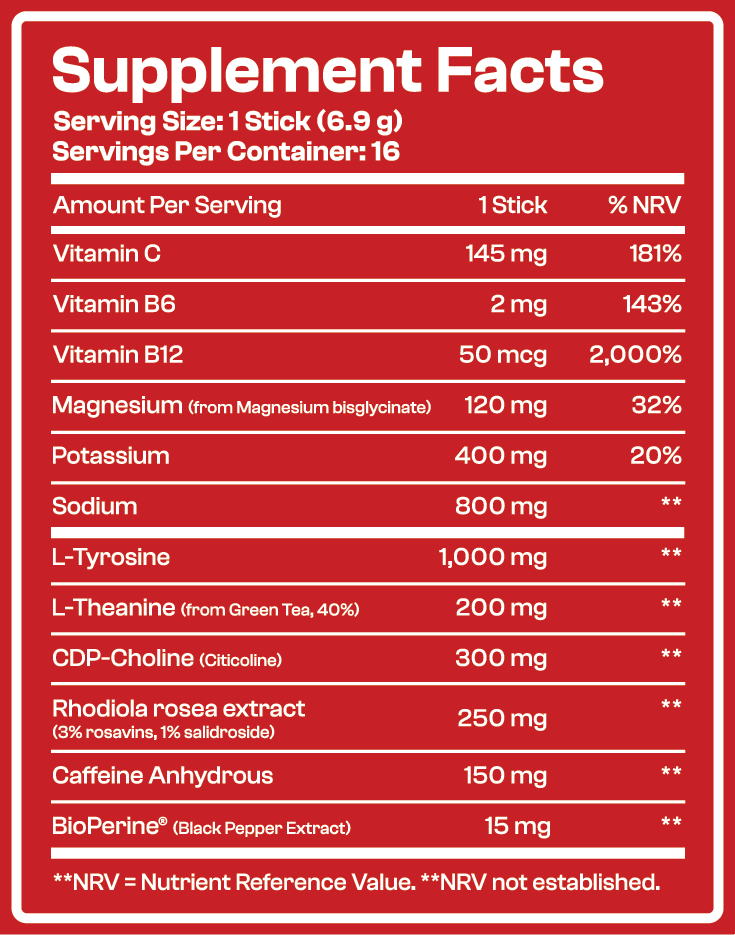 Caffeine is paired with L-Theanine and nootropics like L-Tyrosine and CDP-Choline to support clear thinking and focus without the harsh spike and crash you get from many pre-workouts or energy drinks.